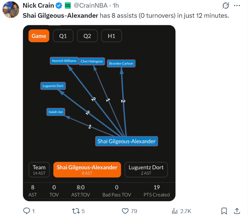 这场比赛的亚历山大是全方位的压制扬尼斯,在短短12分钟里SGA连续送出8个助攻平半场生涯新高:一次给乔、2次给多尔特、2次给肯里奇、1次给切特、2次给卡尔森。亚历山大作为一名1.98米的控球后卫大局观太强大了。